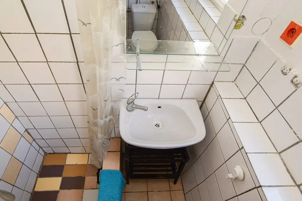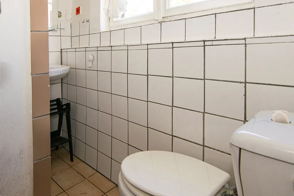 Koupelna se sprchovým koutem a toaletou je přístupna přes garáž anebo ze zahrady. Bohužel nemá přímý vstup z obytné části chaty.