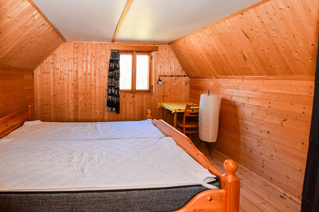 V přízemí je prostorná veranda, obývací pokoj, jídelna a kuchyně. Z kuchyně vedou schody do podkroví, kde jsou dvě částečně oddělené ložnice s dvěma manželskými postelemi.