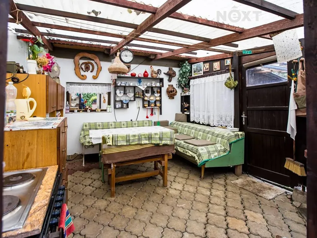 Zahrada je prostorná a nabízí dva zděné domky – jeden slouží jako dílna, sklad nářadí a letní kuchyně s půdou na seno nebo sezónní věci, druhý jako dřevník, kolárna a bouda pro psa. Součástí zahrady je také krytá pergola s elektrickým sporákem a krbem, z níž je přístup do hospodářské části pro chov drobného zvířectva.
