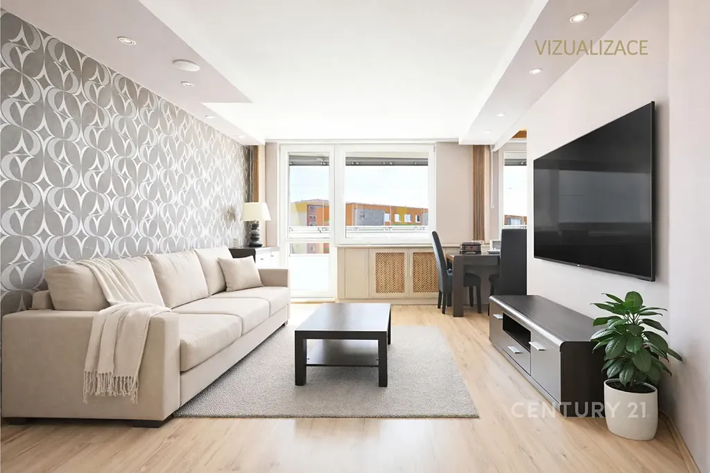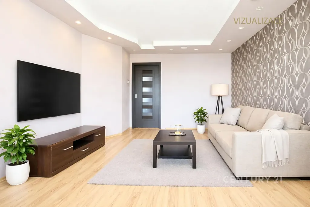 Obývací pokoj: Místnost s dekorativní tapetou, sádrokartonovými podhledy s bodovým osvětlením a plovoucí podlahou. Součástí prezentace jsou i vizualizace pro lepší představu o budoucím uspořádání.