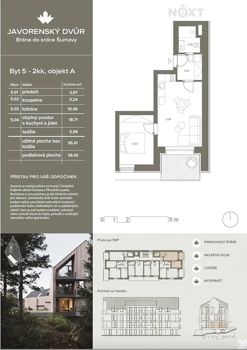 Nabízíme apartmán 2+kk o celkové ploše 38 m² s lodžií 5,96 m² a krásným výhledem do přírody. Součástí ceny je sklepní kóje (2,2 m²) a venkovní parkovací stání.