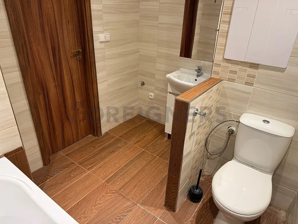 Koupelna je vybavena klasickou vanou, umyvadlem a toaletou, což nabízí ideální prostor pro relaxaci po náročném dni.