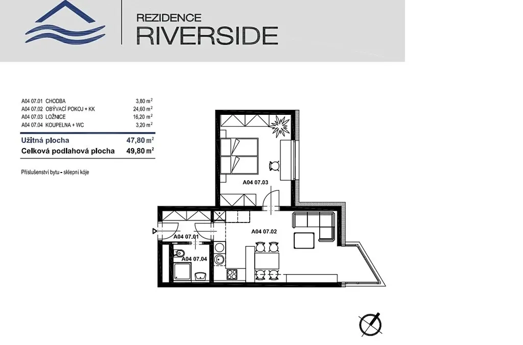 Dispozice: chodba 3,8 m², koupelna + WC 3,2 m², ložnice 16,2 m², obývací pokoj + kuchyňský kout 24,6 m² + sklepní kóje 2,6 m²