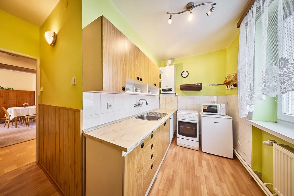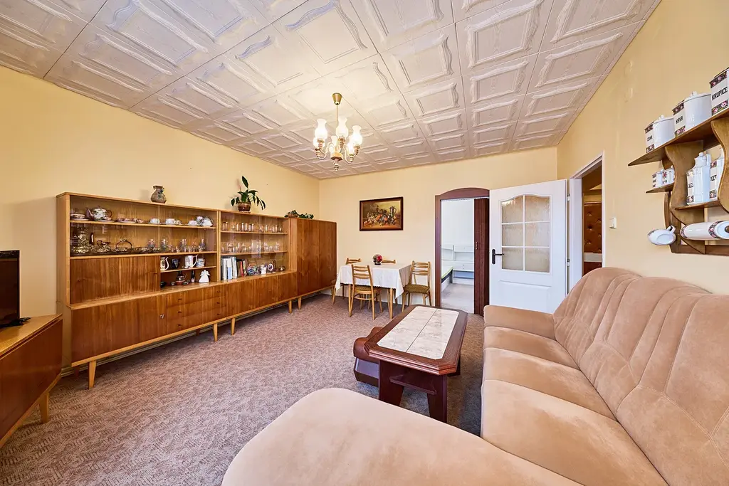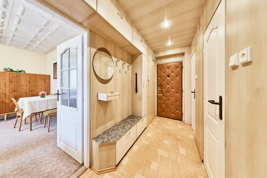 Dispozice bytu: předsíň 4,5m2, po levé straně samostatné WC 0,8m2, koupelna s vanou 2,55m2 a dále vstup do kuchyně 8,7m2. Vedle kuchyně je menší pokoj 11m2 se vstupem z kuchyně nebo z chodby. Po pravé straně je obývací pokoj 18,9m2 a ložnice 13m2. V obytných místnostech jsou jako podlahové krytiny parkety ve vynikajícím stavu. Byt má plastová okna s žaluziemi a za zmínku stojí deskové radiátory ve všech místnostech. K bytu patří prostorný zděný sklep o výměře 7m2. Ohřev vody a vytápění zajišťuje plynový kotel.