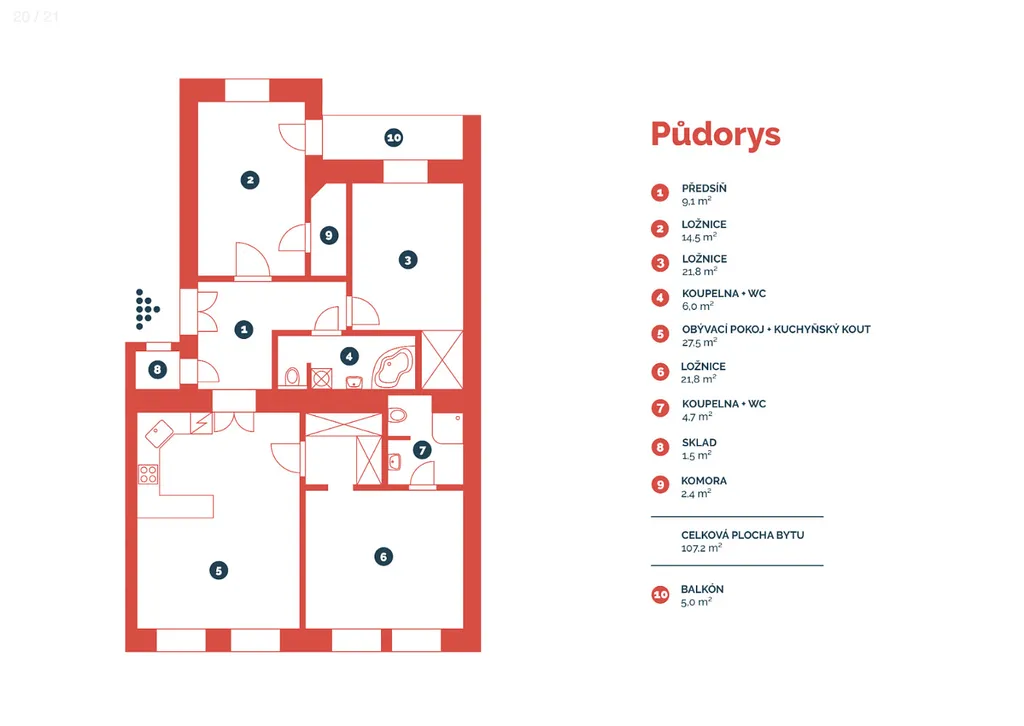 Nabízím k pronájmu nádherný a velmi prostorný byt o dispozici 4+kk (+komora v bytě) a balkon do vnitrobloku a podlahové ploše 107 m² byt a 5 m² balkon, který se nachází ve 4. nadzemním podlaží cihlového domu po rekonstrukci.