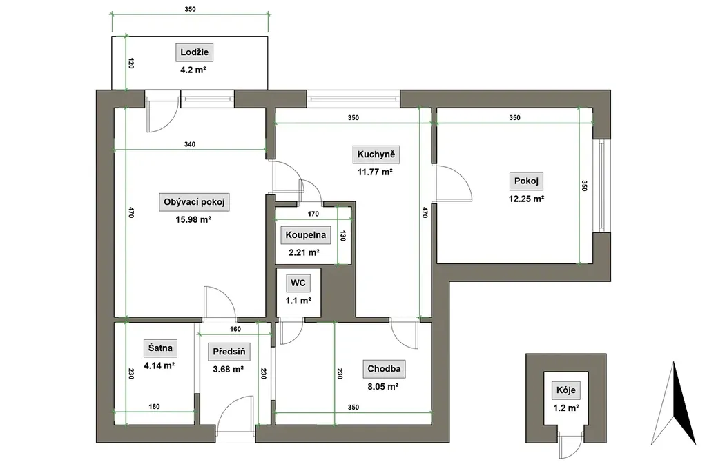 - celková plocha bytu cca 60 m² + lodžie 4,2 m² + komora 1,2 m² +