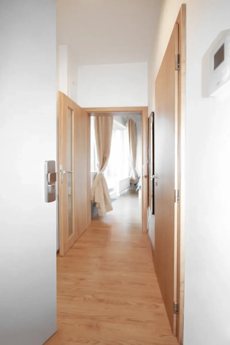 Předsíň: Účelně navržená chodba s věšákovou stěnou a botníkem maximalizuje využití prostoru ve prospěch hlavní obytné části.