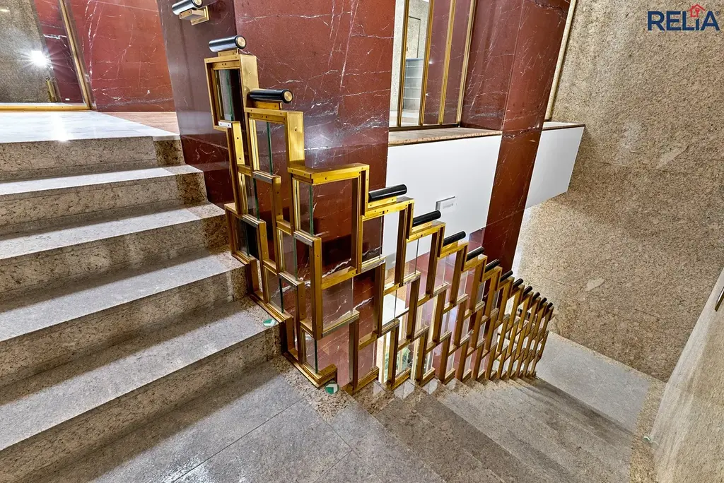 Interiér je pak fascinující souhrou dvou světů: společné prostory a schodiště dýchají luxusem monumentálního stylu Art Deco (leštěný kámen, mosazná zábradlí, velkorysé portály). Samotné pracovní zóny (se světlou výškou až 3,1 m) jsou naopak z velké části vysoce moderní, vzdušné a místy oddělené skleněnými příčkami.