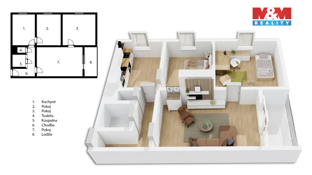 Byt nabízí prakticky řešenou dispozici – prostornou předsíň, velký obývací pokoj se vstupem na lodžii, samostatnou kuchyni, dva další pokoje, koupelnu a oddělenou toaletu. Velkým benefitem jsou také úložné prostory: k bytu náleží komora na patře a sklep o výměře téměř 4 m².