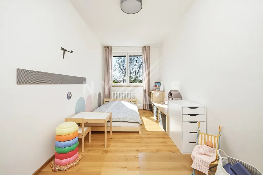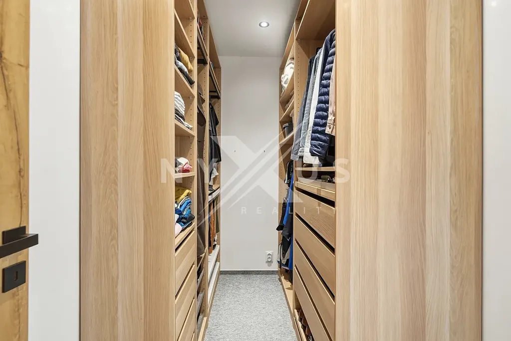 Praktickým benefitem jsou neprůchozí pokoje, dostatek denního světla díky orientaci na jih a jihozápad i promyšlené úložné zázemí v podobě šatny a vestavěných skříní.
