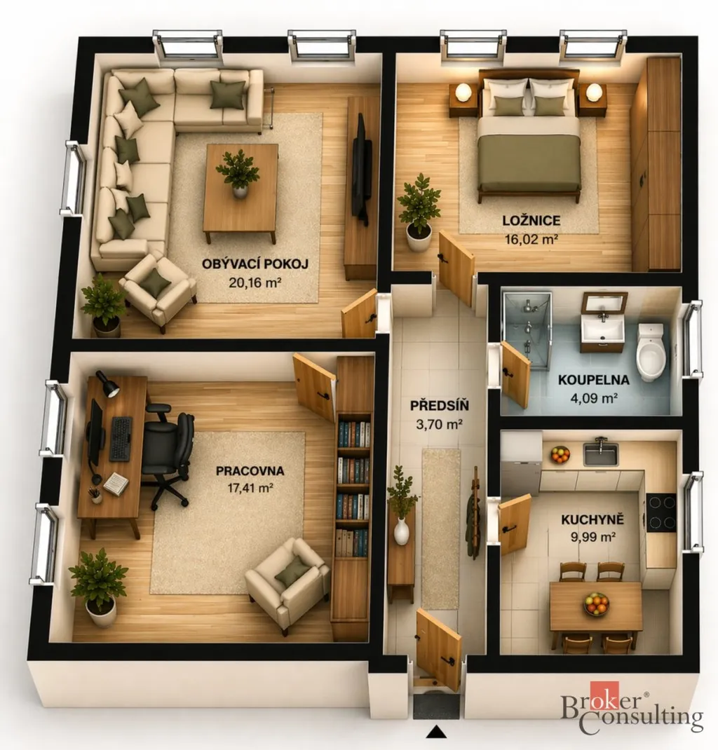 Byt nabízí velmi dobře využitelnou dispozici 3+1, která vyhoví jak páru, tak rodině s dětmi nebo zájemcům, kteří ocení samostatný pokoj navíc pro pracovnu či hosty. Praktickým benefitem je také technická místnost, kterou v běžných bytech často nenajdete, přitom v každodenním fungování dává velký smysl – pro pračku, sušičku, skladování i domácí zázemí.
