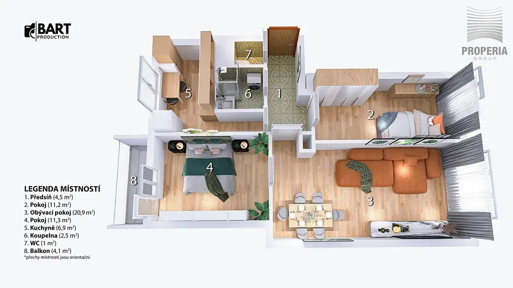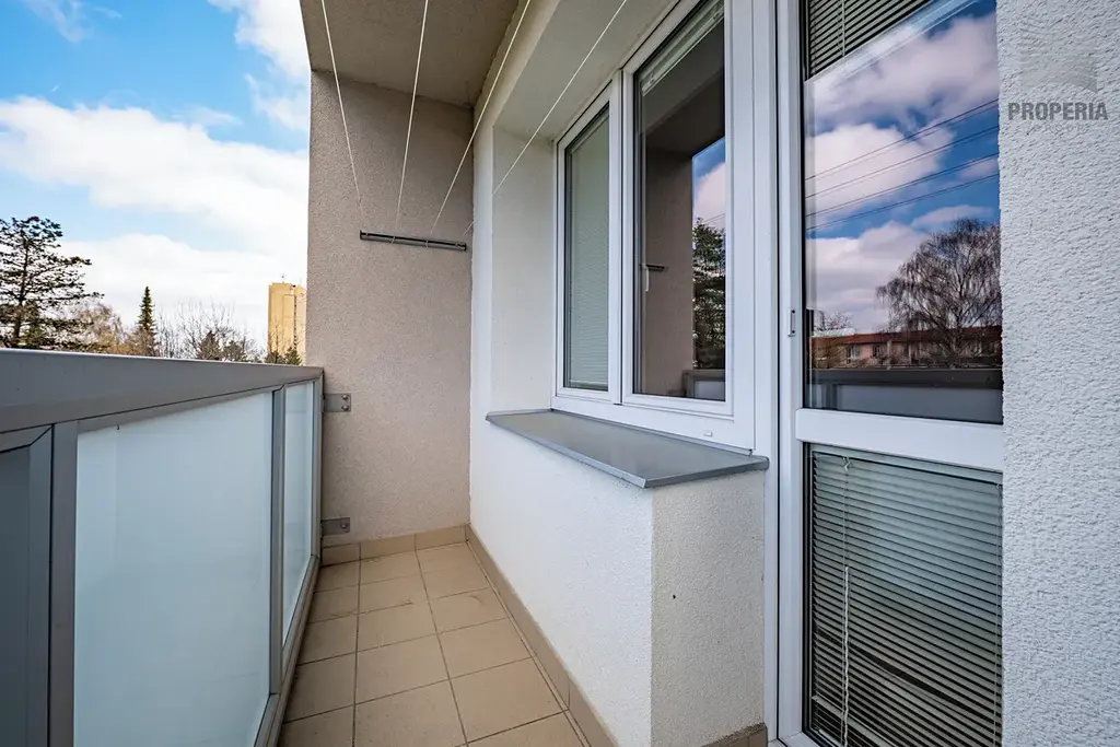 Dispozice bytu tvoří prostorný obývací pokoj o velikosti 20,9 m², dvě samostatné ložnice o velikosti 11,3 m² a 11,2 m², samostatná kuchyně o velikosti 6,9 m², koupelna, samostatné WC, předsíň a lodžie o velikosti 4,1 m². Velkou výhodou bytu je právě lodžie orientovaná do klidného zeleného prostoru, která zvyšuje celkový komfort bydlení.