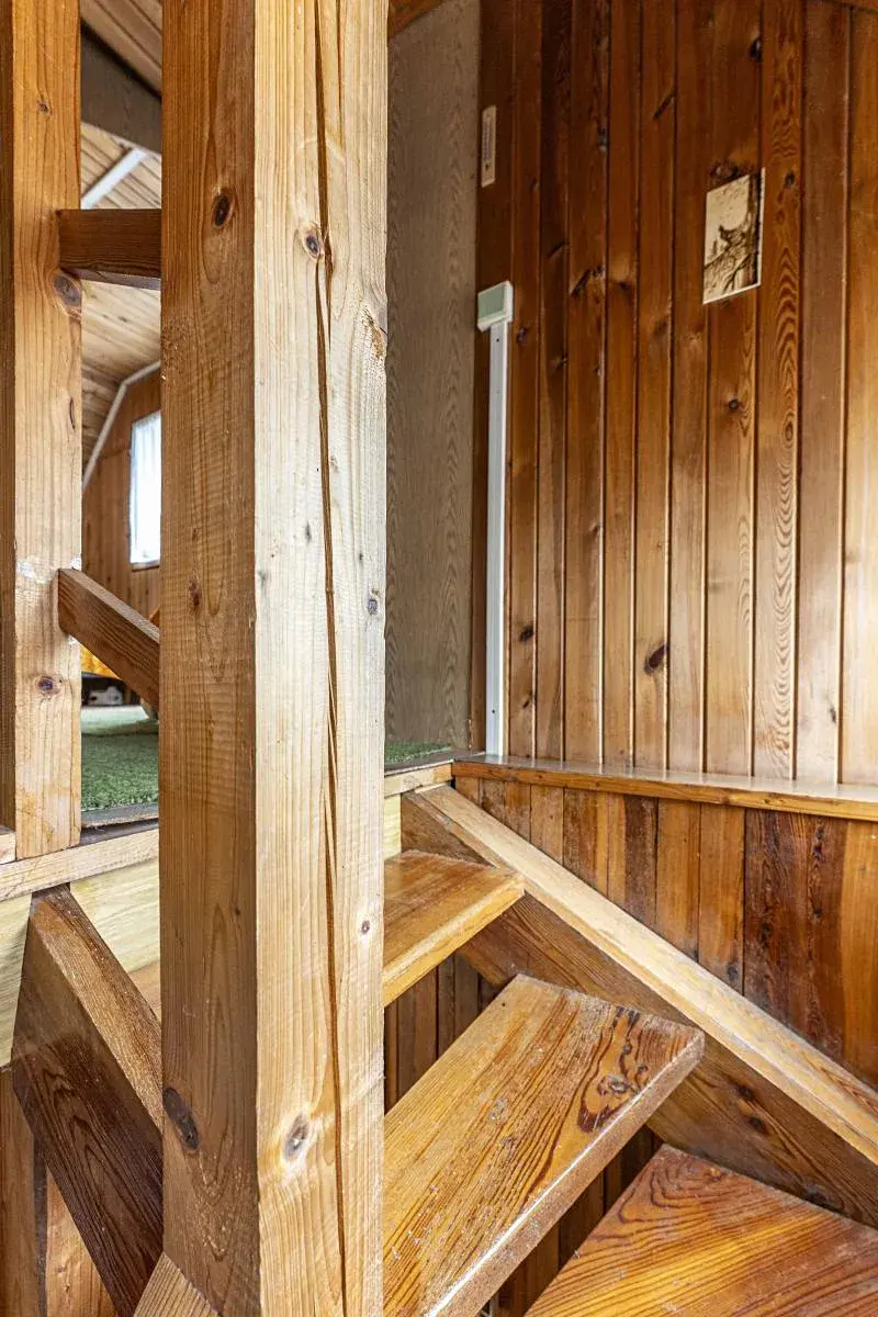 Prostřední patro budovy má také svůj vlastní vchod z horní části svahu. Vstupuje se do chodby. Po pravé straně je pokoj pro hosty a vlevo kuchyně s oknem na sever. Najdete zde kamna, kterými se topí v chladných dnech, kuchyňskou linku s plynovým sporákem (na plynové bomby), troubou a mikrovlnkou.