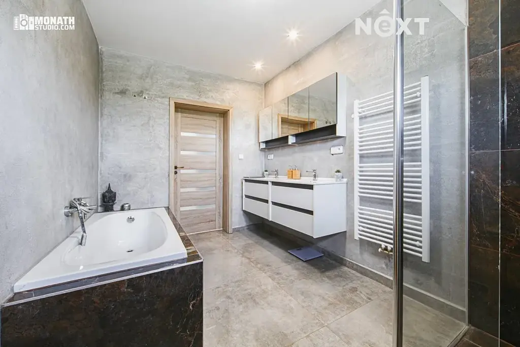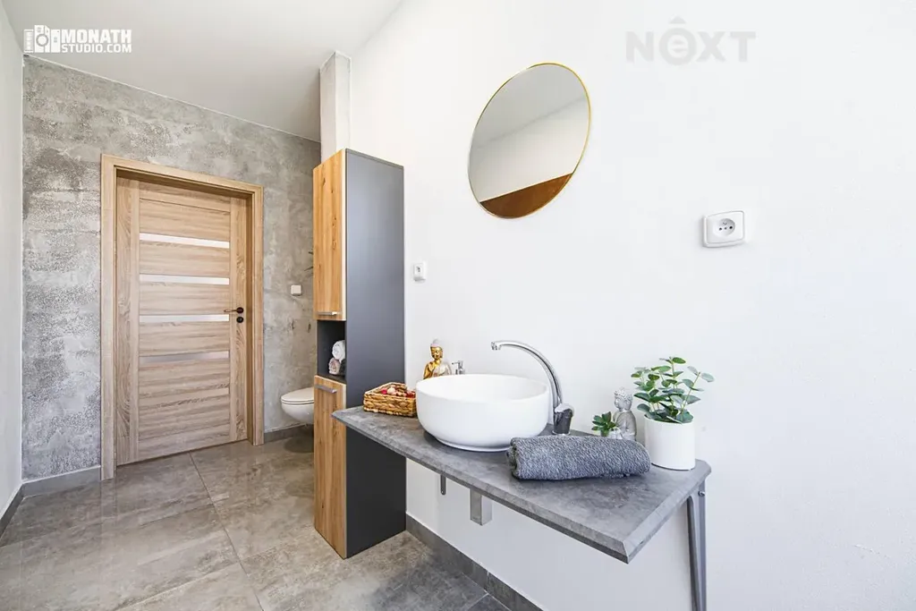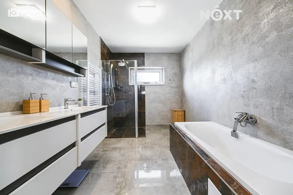 • Koupelna a WC: velkoformátová dlažba v dekoru šedého betonu.