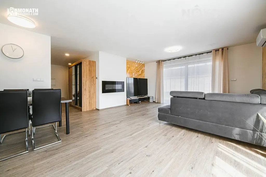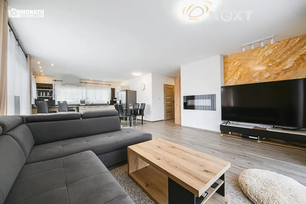 • Prostorný obývací pokoj se dvěma HS portály a přímým vstupem na terasu; elektrický krb vytváří příjemnou atmosféru.