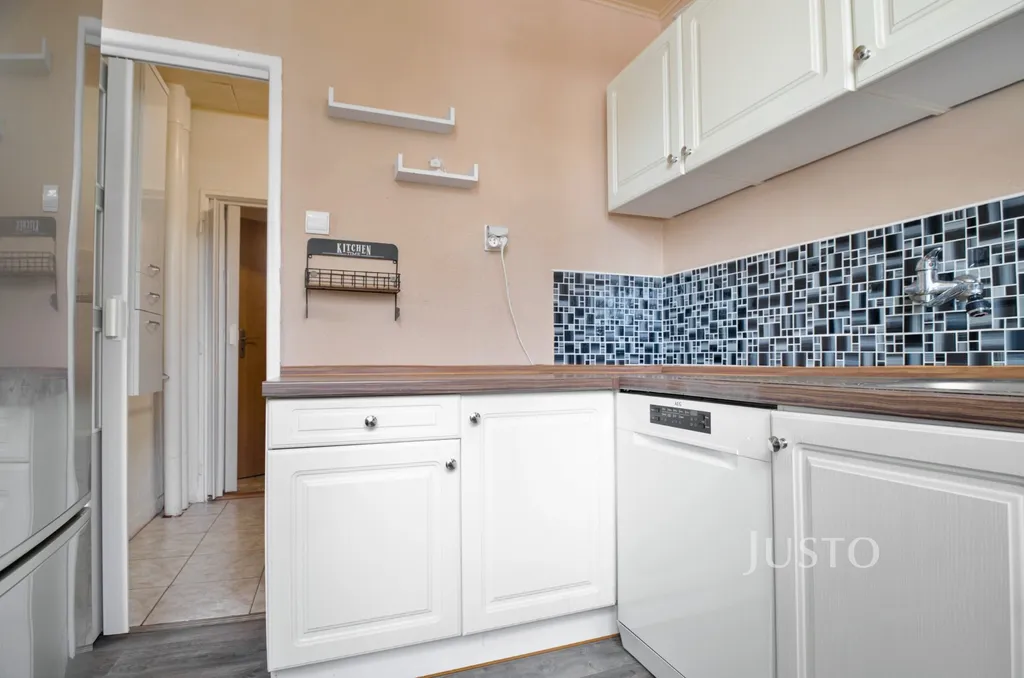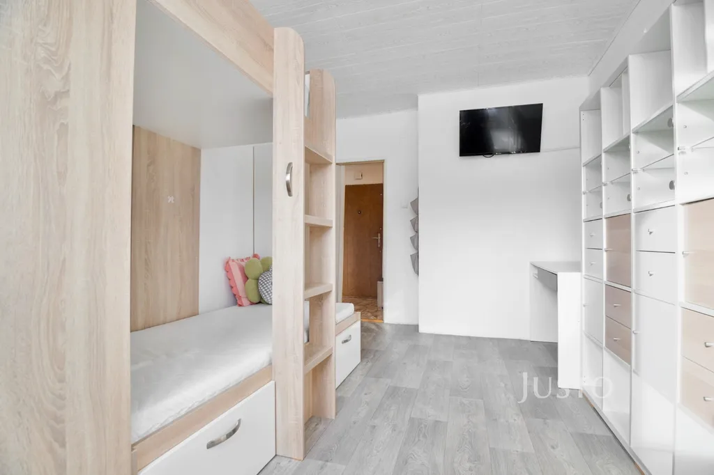 Interiér bytu nabízí světlé a prostorné místnosti. Dětský pokoj je vybaven moderními vestavěnými patrovými postelemi a dostatkem úložného prostoru, což ocení zejména rodiny s více dětmi. Velká okna propouštějí dostatek denního světla a zajišťují příjemnou atmosféru v celém bytě. V předsíni je instalována praktická šatní stěna s lavicí, která poskytuje pohodlí při každodenním užívání.