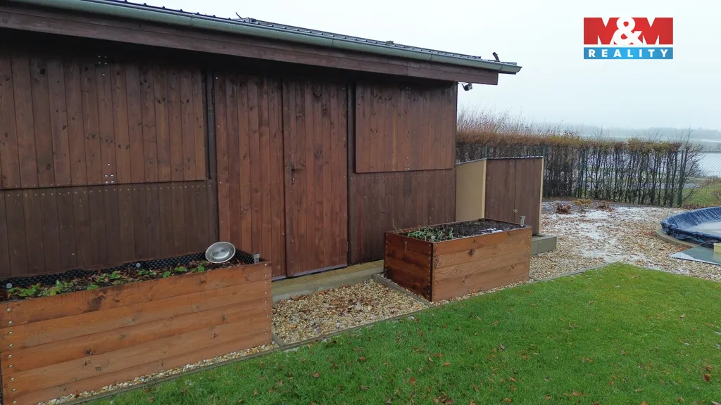 Pergolu s kuchyňským koutkem a s posezením 20 m². Garáž 8,16 m² a zahradní domek 20,06 m² s možností předělat na ložnici. Vrt na vodu hluboký 24 m. Zpevněnou příjezdovou cestu.