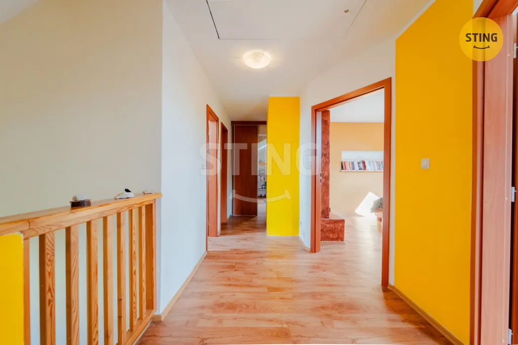 V patře jsou tři samostatné pokoje (jeden s vlastním balkónem), velkorysá herna s možností vybudování druhé kuchyně či zázemí pro dospívající děti, dále prostorná koupelna a komora. Dispozice tak ideálně odpovídá potřebám čtyřčlenné rodiny – každý má svůj klid a zároveň dostatek společného prostoru.