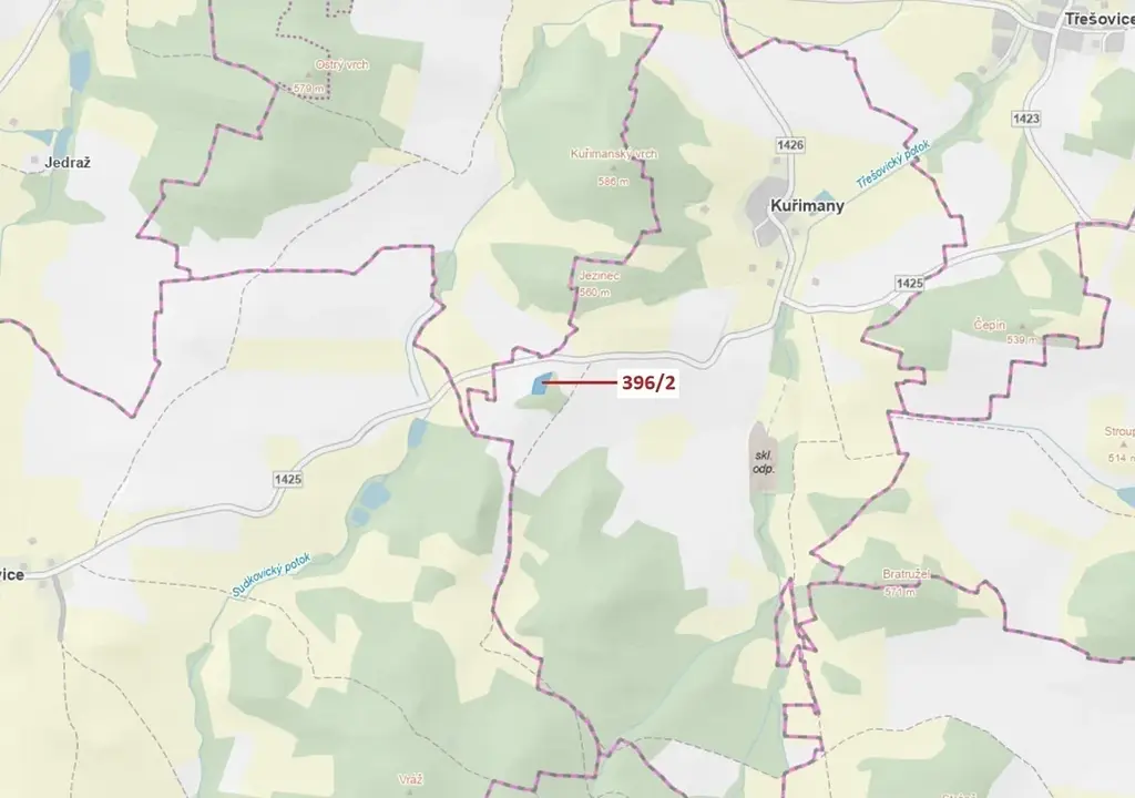 Lesní pozemek o výměře 3340 m2, parcelní číslo 396/2, podíl 1/1, katastrální území Kuřimany, obec Kuřimany, obec s rozšířenou působností Strakonice, okres Strakonice, Jihočeský kraj.