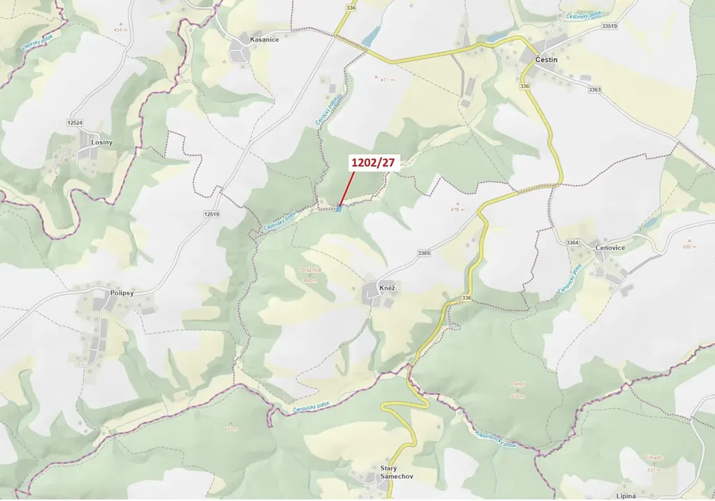 Lesní pozemek o výměře 2055 m2, parcelní číslo 1202/27, podíl 1/1, katastrální území Kněž u Čestína, obec Čestín, obec s rozšířenou působností Kutná Hora, okres Kutná Hora, Středočeský kraj.