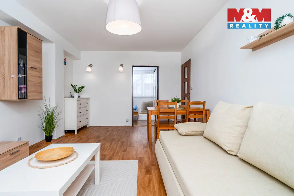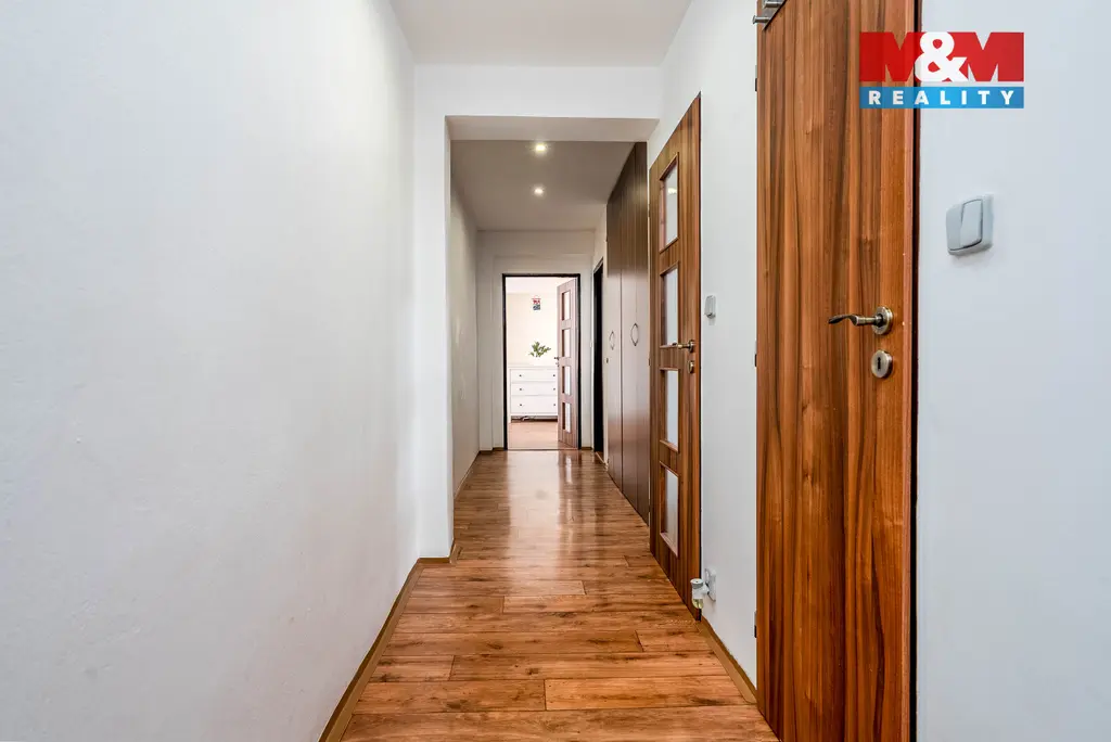Dispozice: vstupní chodba s vestavěnou skříní, koupelna s vanou, samostatná toaleta, kuchyně, obývací pokoj, ložnice a dětský pokoj. Okna jsou orientována na sever, lodžie na jih, což zajišťuje dostatek denního světla.