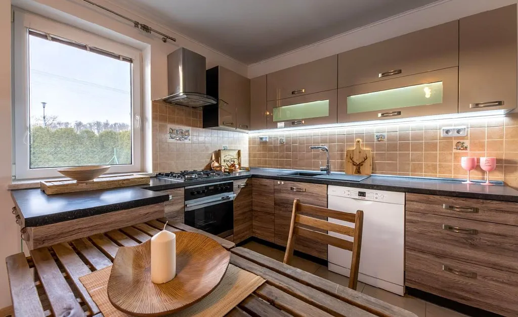 Zádveří: odkládací stěna - botník, skříň, věšák na kabáty, zabezpečovací systém, wi-fi , podlahové topení; Koupelna: umývadlo se skříňkou, skříňka se zrcadlem, skříňka na toaletní věci, rohová vana zabudována do rohu – slouží také jako sprchovací kout s talířovou sprchou, žebříkové topení, bodovky; WC: WC kombi, malé umývadlo se skříňkou a baterií; Kuchyň a obývacím pokojem: kuchyňská linka ve tvaru U, vestavěná elektrická trouba, sklokeramická plynová deska, černý granitový dřez s odkládací plochou, nerezový odsávač pár, myčka na nádobí, v obývací části krb s krbovou vložkou na dřevo vč. průduchů do jednotlivých místností, balkonové dveře s východem na terasu; Dětský pokoj: nezařízený; Ložnice: nezařízená, ;