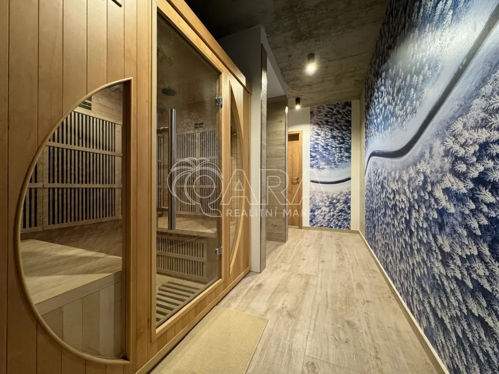 V koupelně najdete vanu, sprchový kout a toaletu. K tomu všemu patří také vlastní infrasauna a vedle ní druhý sprchový kout. Byt tedy nabízí jedinečný komfort bydlení, který si budete každý den užívat plnými doušky.