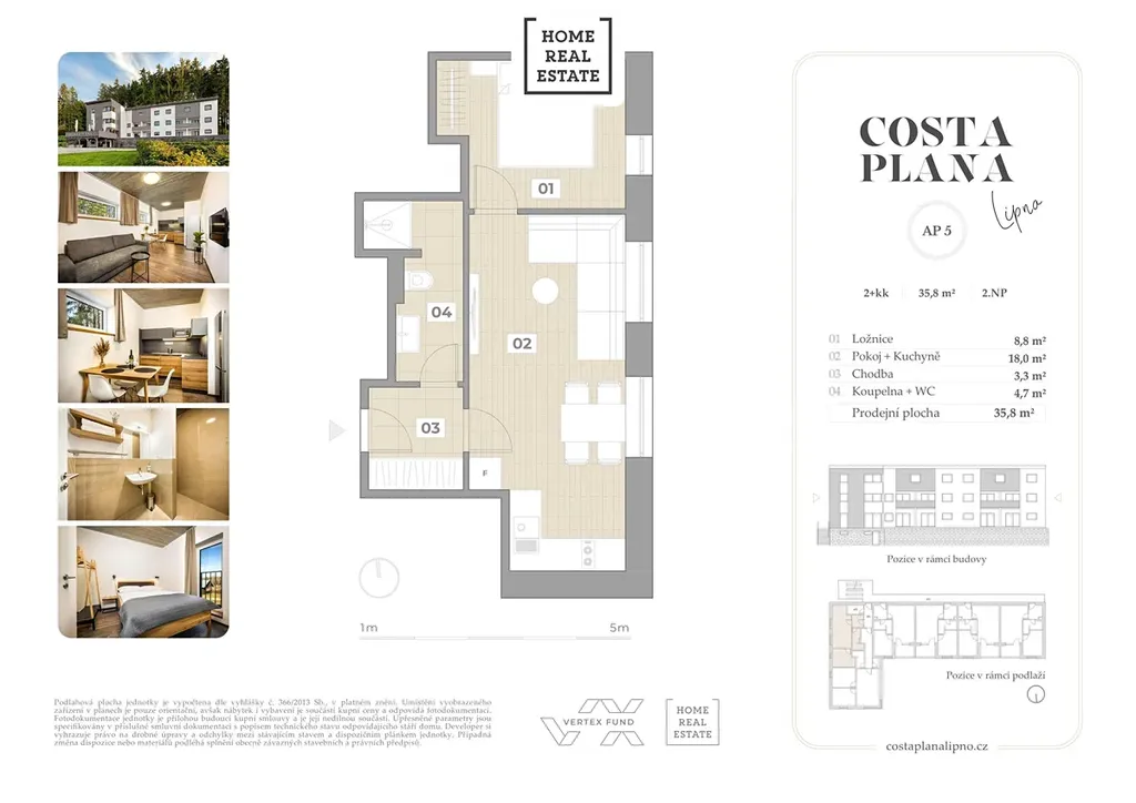Home Real Estate si dovoluje exkluzivně nabídnout k prodeji plně vybavený designový apartmán o dispozici 2+kk s výměrou podlahové plochy 35,8 m², který se nachází v 2NP projektu Costa Plana Lipno.