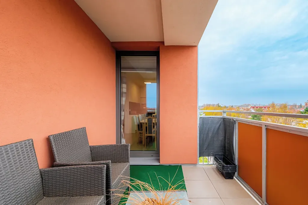 K bytu patří venkovní parkovací místo (za příplatek 1000 Kč/měsíc) a komora v mezipatře domu.