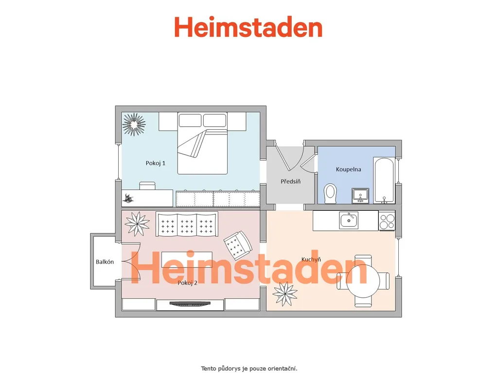 Byt zaujme především vyváženou dispozicí, kdy všechny místnosti jsou velikostně velmi podobné, což nabízí široké možnosti využití – ať už pro pár, spolubydlení nebo menší rodinu.
