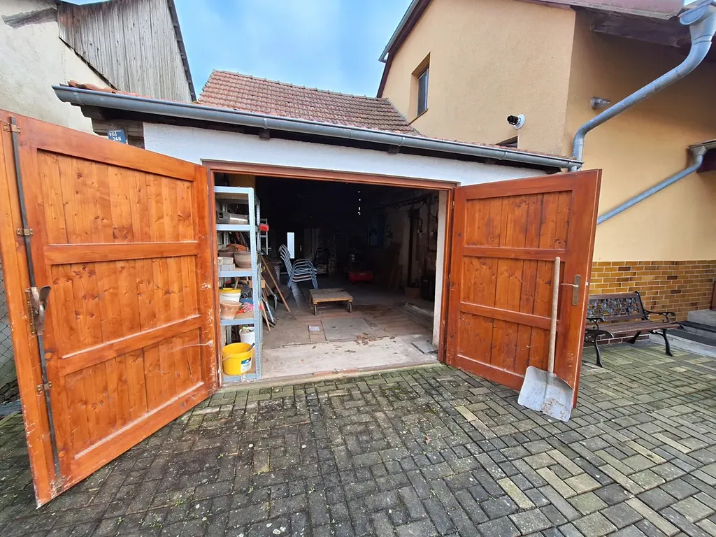 Prostorná zahrada před domem. Za domem druhá část zahrady s dílnou/kolnou. Vedle domu prostorná garáž, dostatečně velká i na dílnu. Do domu se vchází přes zápraží, v domě je vstupní chodba z té se vchází do dvou pokojů (žlutý průchozí a modrý). Z chodby se schody do podkroví se projde do kuchyně, která je průchozí do obývacího pokoje a do ložnice. V přízemí domu je ještě koupelna a špajz/spíž.
