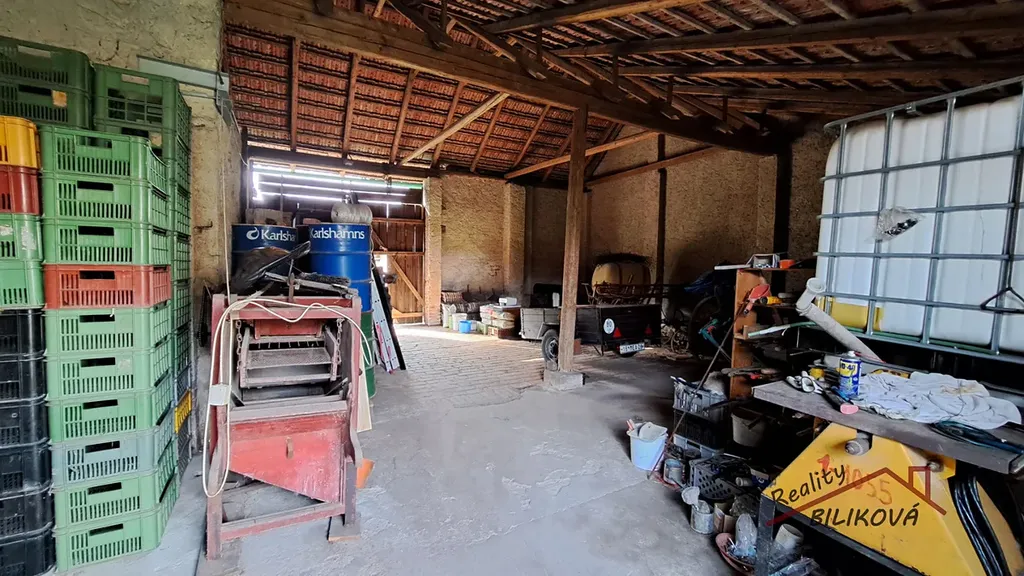 Jeden pozemek s domem a stodolou, druhý pozemek je zahrada. Lze použít jako dva stavební pozemky. Dům o dispozici 2+1, koupelna, samostatné WC, komora. IS: tlaková kanalizace, plynová přípojka, el. 220/380V. Vytápění akumulační kamna, kamna na tuhá paliva. Ohřev vody lázeňskými kamny. Zastavěná plocha domu je 90m2 a stodoly s garáží 230m2. Ve stodole sklep. Na pozemcích 2 studny.