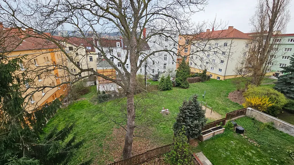 Okna obou pokojů jsou obrácená do klidného vnitrobloku, který je zatravněný s malým hřištěm pro děti.