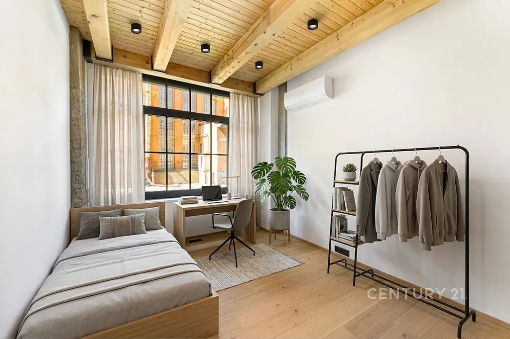 Interiér kombinuje industriální prvky s kvalitními materiály – dřevěné podlahy v dekoru dubu, designové schodiště, osvětlení v industriálním stylu, stěna z pohledového betonu, ocelové detaily a přiznané betonové konstrukce. Pokoje jsou oddělené designovými skleněnými příčkami.