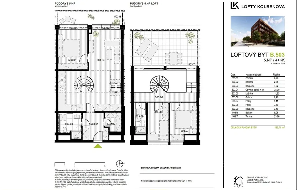 Nabízíme k prodeji výjimečný loftový byt o dispozici 4+kk v projektu Lofty Kolbenova, Praha 9 – Vysočany. Byt se nachází v 5. nadzemním podlaží a disponuje podlahovou plochou 133,71 m².