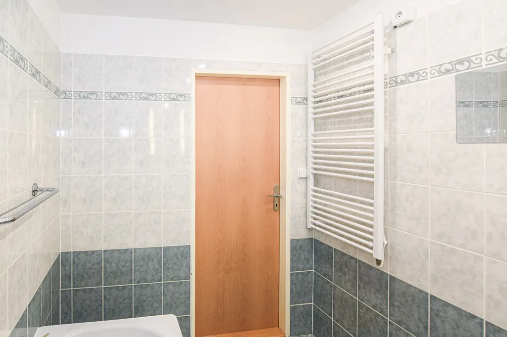 Na podlaze je položená dlažba v kombinaci s plovoucí podlahou.