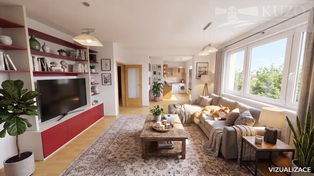 Důležité k fotodokumentaci: Fotografie označené nápisem „VIZUALIZACE“ slouží pro lepší představu o možnostech uspořádání nábytku a potenciálu prostoru. Ostatní fotografie věrně zachycují aktuální stav bytu.