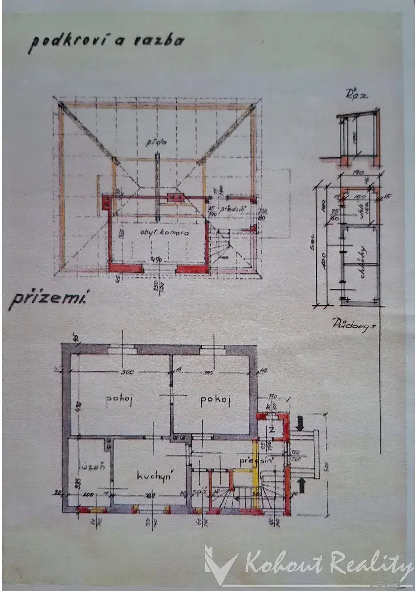 Podkroví: aktuálně jedna místnost a půdní prostor, který lze přebudovat na prostorný byt 3+kk (cca 65 m2) s vikýři