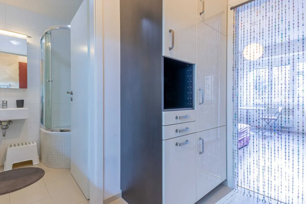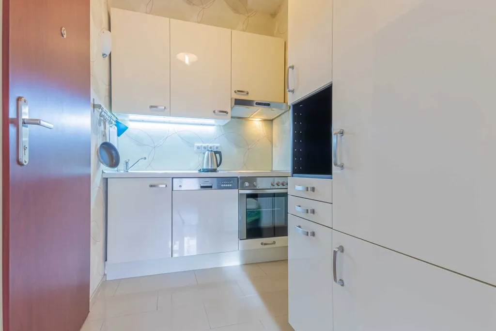 Byt se nabízí částečně vybavený. Kuchyňská linka disponuje vestavěnou elektrickou troubou, sklokeramickou deskou a myčkou. Obývací část je útulně zařízená postelí, prostornou šatní skříní a stolem s židlí. V nové koupelně je sprchový kout, umyvadlem, pračkou a toaletou.