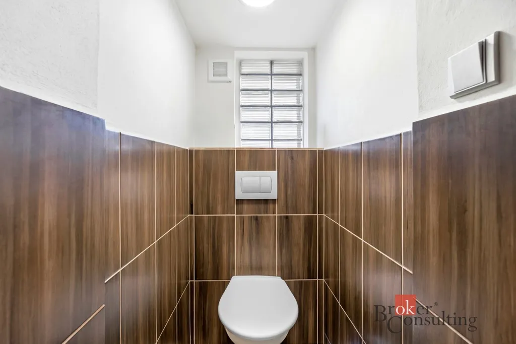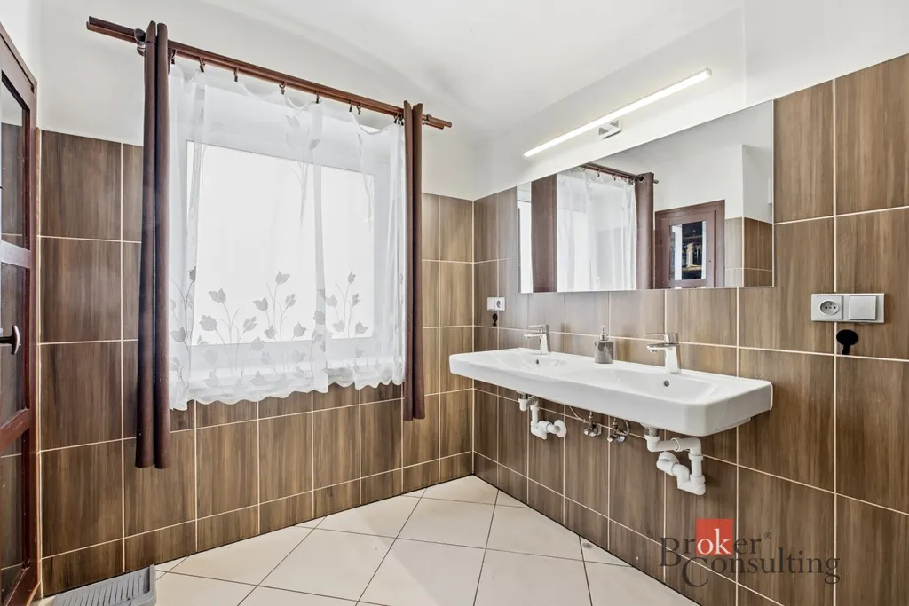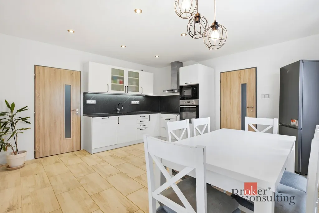 Přízemí domu prošlo decentní rekonstrukcí. Prostornou kuchyni se skrytou přípravou na centrální ostrůvek a velkorysou koupelnu, doplňují dvě další místnosti a samostatné WC. Ve vstupní chodbě najdeme kamna s napojením na akumulační nádobu a o teplo se tak může starat podlahové vytápění. Vše doplňují nové vstupní dveře a plastová okna s trojskly.