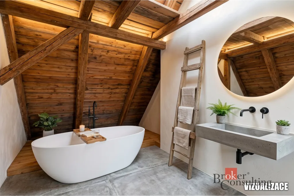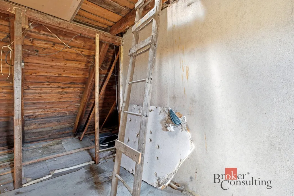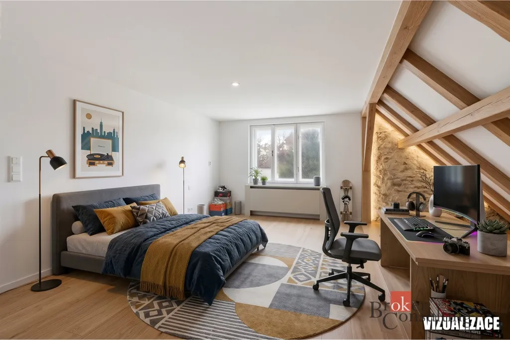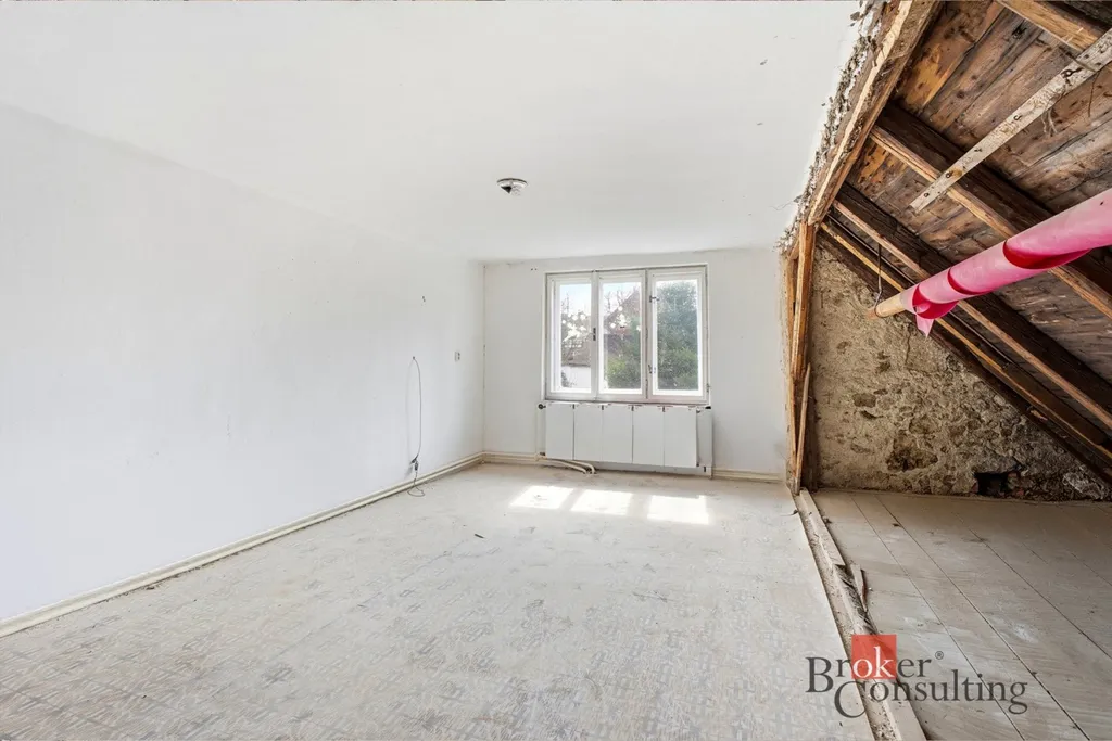 V prvním patře čeká nové majitele vlastní realizace. Rozsáhlý prostor umožní vybudování minimálně dvou pokojů, případně i koupelny. Půda poskytuje další úložné prostory, kde může vzniknout například otevřený prostor pro hernu.
