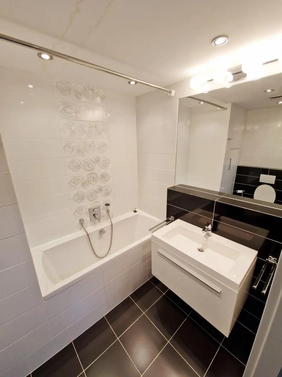 V kuchyni je pěkná kuchyňská linka s vestavnou troubou a moderní plynovou deskou se čtyřmi hořáky. Koupelna je obložena vkusnými obklady, vybavena vanou, umyvadlovou skříňkou a toaletou. Po celém bytě jsou položeny plovoucí podlahy. Celkově se rekonstrukce zaměřila na moderní a vzdušný vzhled. Bytová jednotka se bude pronajímat s vybavením, které vidíte na fotkách.