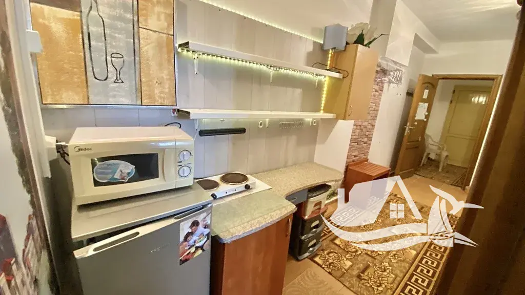 Interiér je prakticky řešený. Vstupní chodba vás přivádí do hlavního obytného prostoru s kuchyňským koutem, který slouží jako centrum celého bytu. Prostor je vzdušný, útulný a snadno přizpůsobitelný podle vašich potřeb. Díky orientaci na východ je byt příjemně světlý a zároveň si udržuje komfortní teplotu během celého roku. Klimatizace zajišťuje pohodlí v letních měsících, zatímco v zimě působí prostor přirozeně teple.