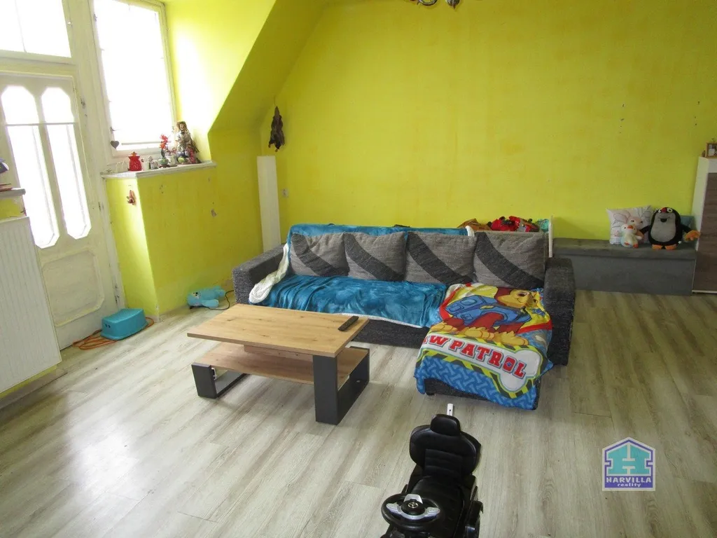 V patře je další byt se vstupní halou, ze které se dostaneme na samostatné WC a do koupelny s vanou, umyvadlem a plynovým kotlem. Z haly je dále vstup do obývacího pokoje s balkonem. Z obývacího pokoje je vstup i do ložnice.
