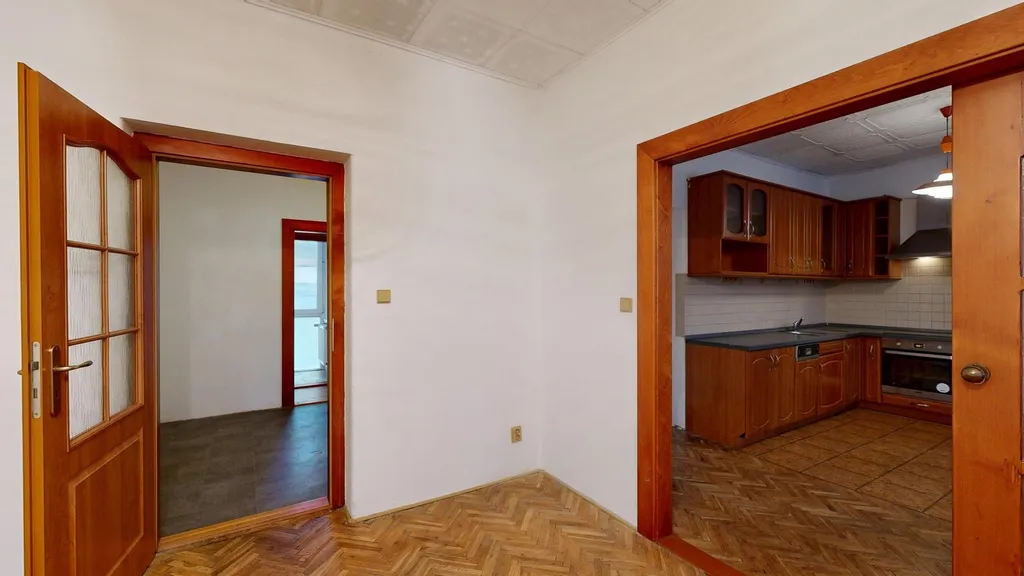 Byt se skládá ze tří pokojů – obývacího pokoje s kuchyňským koutem, koupelny s vanou, samostatné toalety a dvou dalších místností, které lze využít podle potřeb nájemníka (např. jako samostatný obývací pokoj a ložnici).