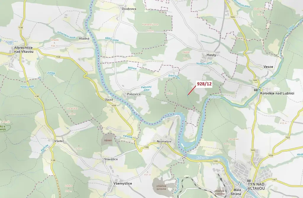 Lesní pozemek o výměře 418 m2, parcelní číslo 928/12, podíl 1/1, katastrální území Hosty, obec Hosty, obec s rozšířenou působností Týn nad Vltavou, okres České Budějovice, Jihočeský kraj. Po těžbě.