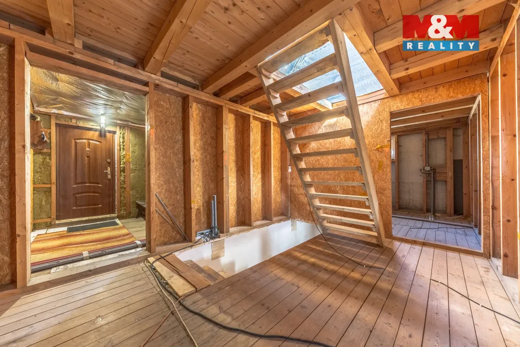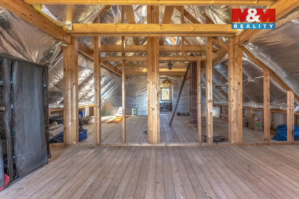 Dům stojí na pozemku o výměře 1 486 m², je částečně podsklepený. Spodní podlaží je zděné, horní dvě podlaží jsou řešena jako dřevostavba. Dispozice přízemí zahrnuje obytný prostor s kuchyňským koutem, zázemí a vstup na terasu s navazujícím balkonem. Horní podlaží jsou připravena k dokončení dle individuálních požadavků.
