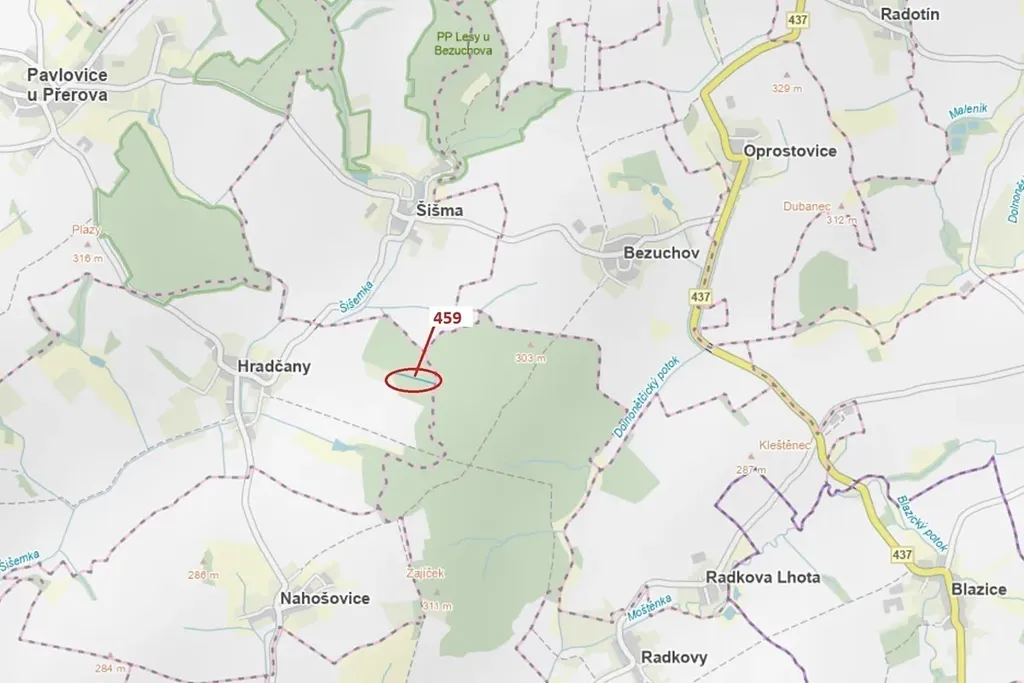 Lesní pozemek o výměře 1895 m2, parcelní číslo 459, podíl 1/1, katastrální území Hradčany na Moravě, obec Hradčany, obec s rozšířenou působností Přerov, okres Přerov, Olomoucký kraj. Po těžbě.