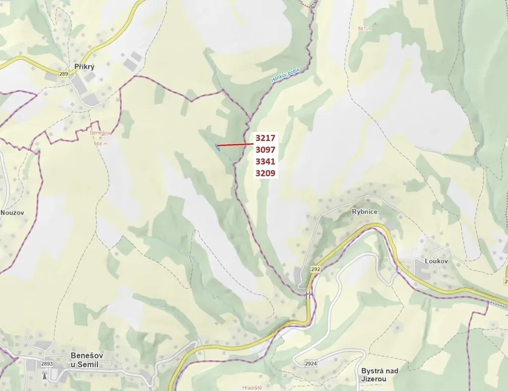 Lesní pozemky a vodní plocha o výměře 1649 m2, parcelní čísla 3217, 3097, 3341, 3209, podíl 1/1, katastrální území Benešov u Semil, obec Benešov u Semil, obec s rozšířenou působností Semily, okres Semily, Liberecký kraj.