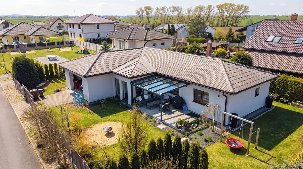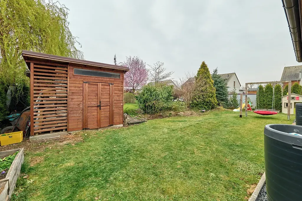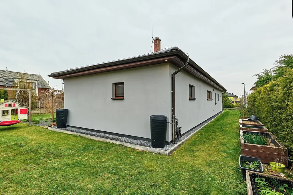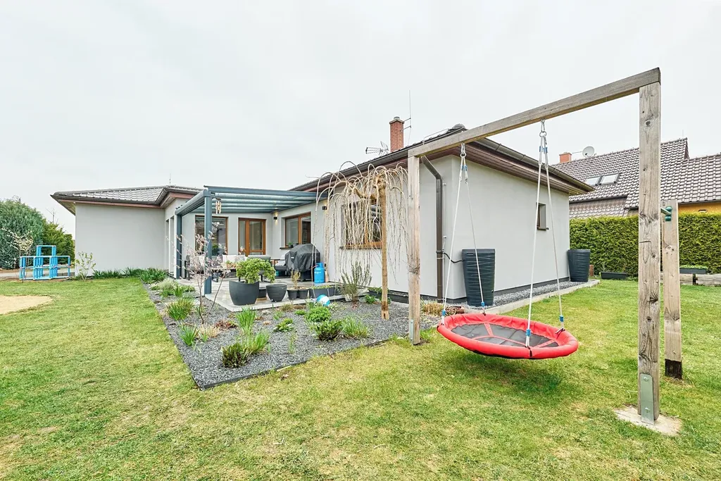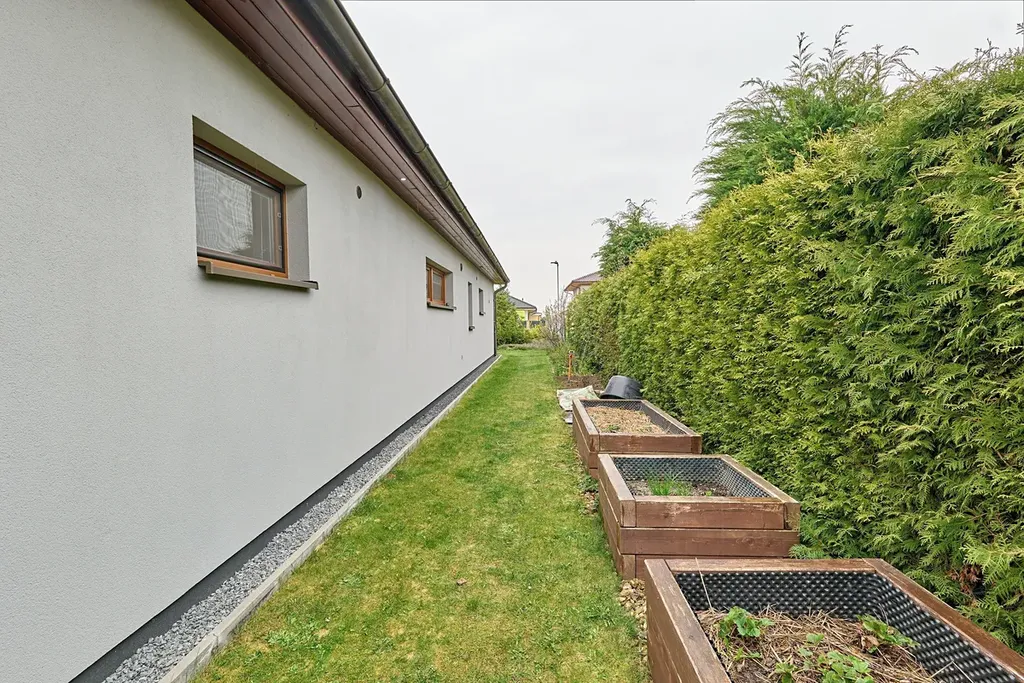 Prostorný dům stojí na skvělé adrese kousek od okraje Prahy ve směru na Brandýs nad Labem. Klidná obec, jejíž historie sahá až do 13. století nabízí skvělou dostupnost do hlavního města. Samotný dům, jehož dispozici vidíte na půdorysu je dispozičně řešen jako 3KK a nabídne prostornou garáž. Rozlehlý obývací pokoj s kuchyní vybavenou vestavnými spotřebiči doplňuje světlý výklenek, ve kterém je situován jídelní stůl a vcházíme z něho na velkou terasu vybavenou moderním hliníkovým zastřešením. To je vybaveno dálkovým ovládáním, kterým lze stáhnout boční stěnu a dále stínění, aby vám zde bylo příjemně i v horkých letních dnech. Dům je obklopen akorát velkou udržovanou zahradou, která disponuje zahradním domkem, houpačkou pro děti a vyvýšenými záhony. Komfortní vjezd na pozemek zajišťuje brána s ovladačem, elektrická vrata do garáže jsou samozřejmostí. Komfort zajišťují dvě koupelny, obě vybaveny WC. Vytápění zajišťuje tepelné čerpadlo.